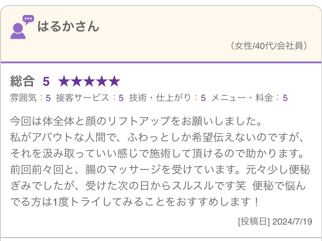 【LU.GINI都島の口コミ】顔リフトアップ&腸マッサージ/フェイシャル&リンパ